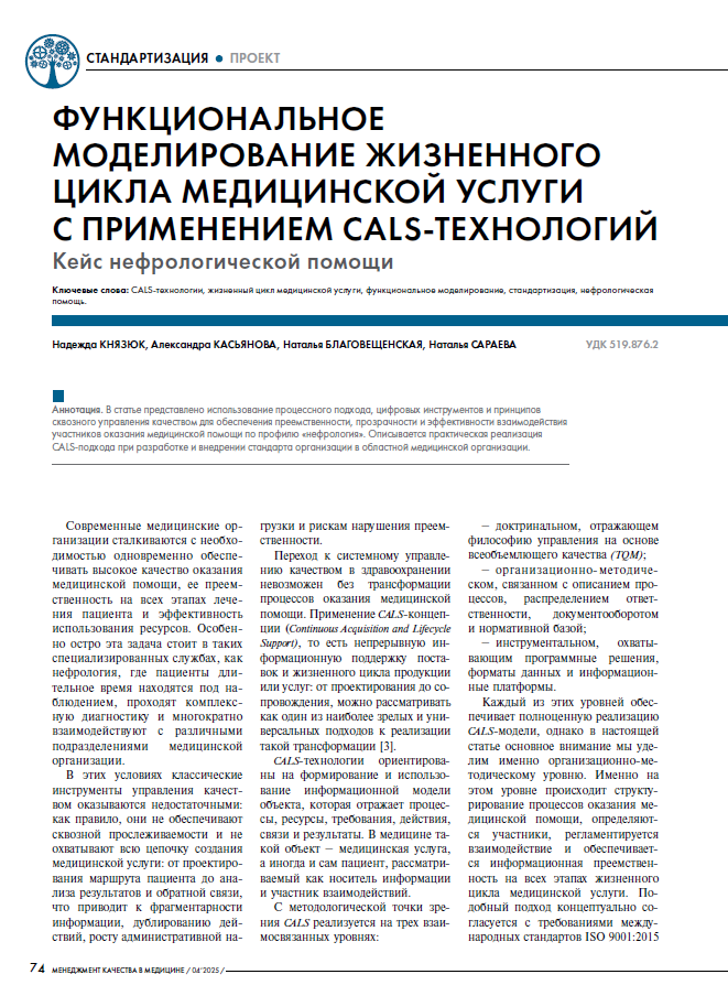 В свежем номере «Менеджмента качества в медицине» (№ 4, 2025) опубликована статья экспертов «Дома качества» — «Функциональное моделирование жизненного цикла медицинской услуги с применением CALS-технологий: кейс нефрологической помощи».